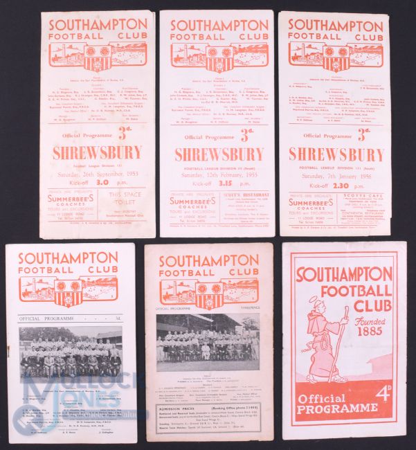 Shrewsbury Town away match programmes v Southampton 1953/54 1954/55, 1955/56 (small tear), 1956/57, 1957/58, 1959/60; fair. (6)