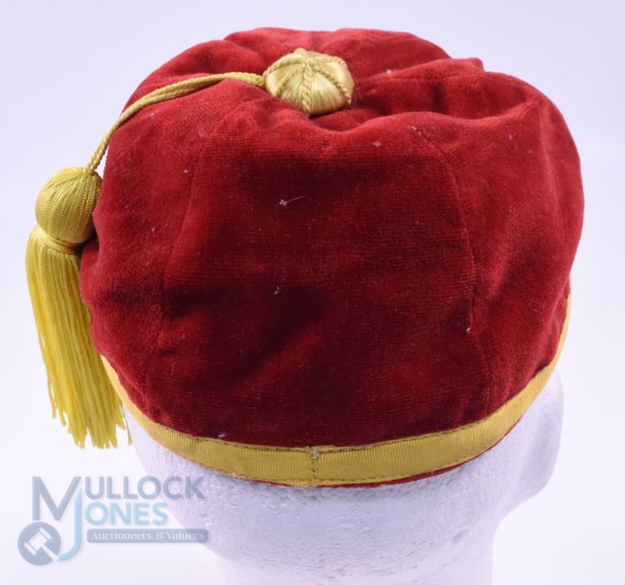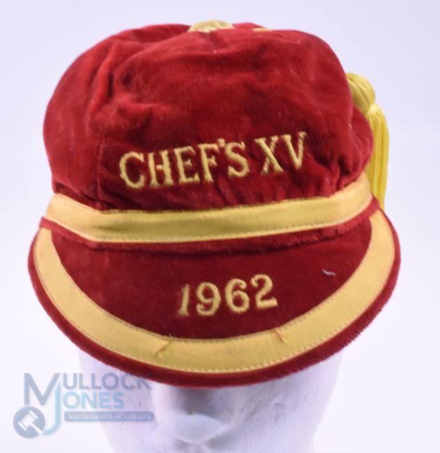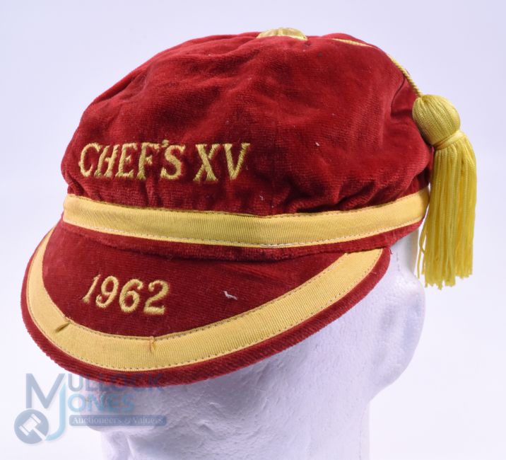 1931 and 1962 Velvet Rugby Honours Caps (2): A six-panelled black and red cap embroidered 'XV' and 1931-2, and one in scarlet and gold for 'Chef's XV 1962', both tasselled and in VG unused condition