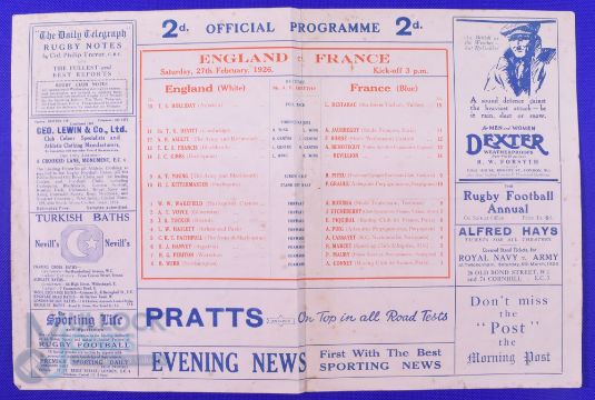 Scarce 1926 England v France Rugby Programme: The early Twickenham newspaper style format, with teams to centre of pages, adverts surrounding. England won 11-0. Some small foxing and minor edge tears. Generally G for 102 years