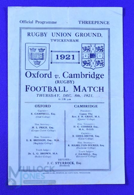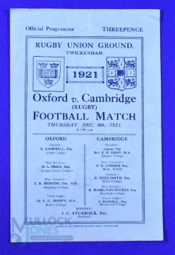 Scarce 1921 Varsity Match Rugby Programme: First Varsity Match to be held at Twickenham, Oxford win. 4pp blue, one fold, G for age