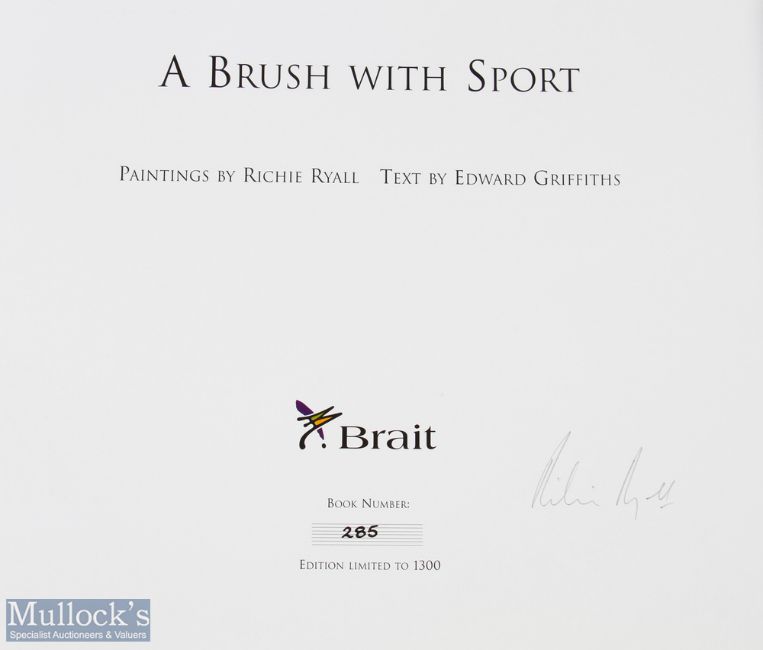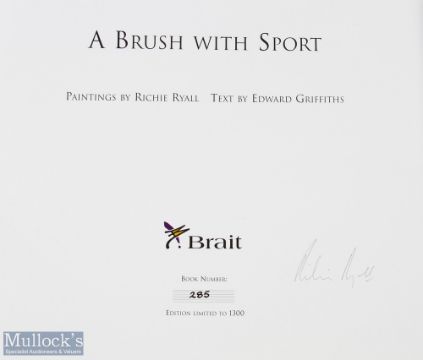Splendid, limited edition 1999 S African Sport inc Rugby Art Volume: Beautifully done, artist Richie Ryall and writer-administrator Ed Griffiths' 'A Brush with Sport', their homage to Springbok sporting success stories to that date, with super colour portraits and action scenes well described in an impressive large format coffee-table book. Much rugby included. No. 285/1300. Excellent
