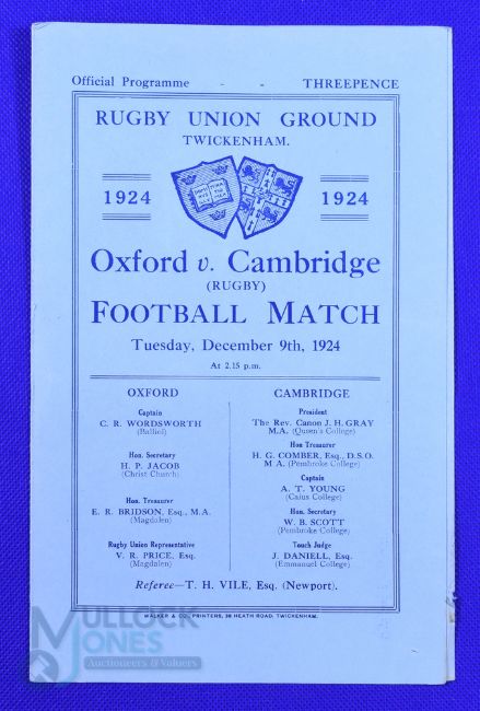 1924 Varsity Match Rugby Programme: Oxford win, many caps current or future, remarkably good condition 4pp blue issue