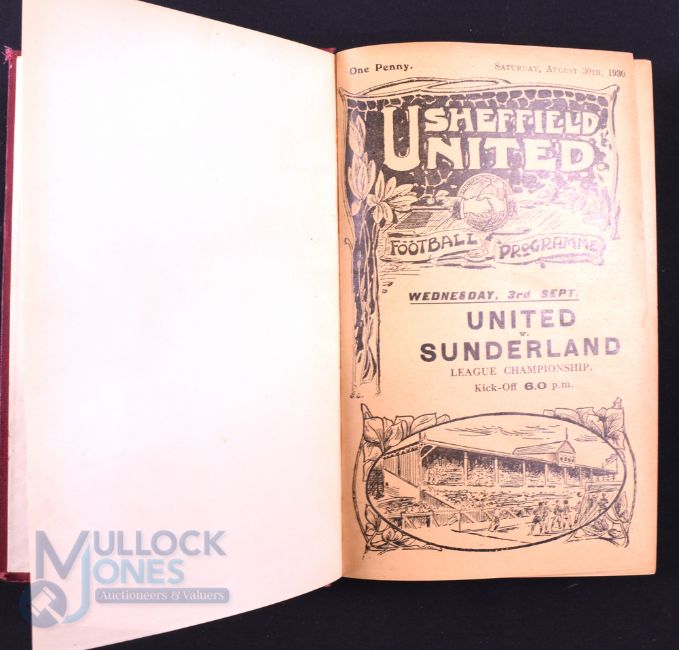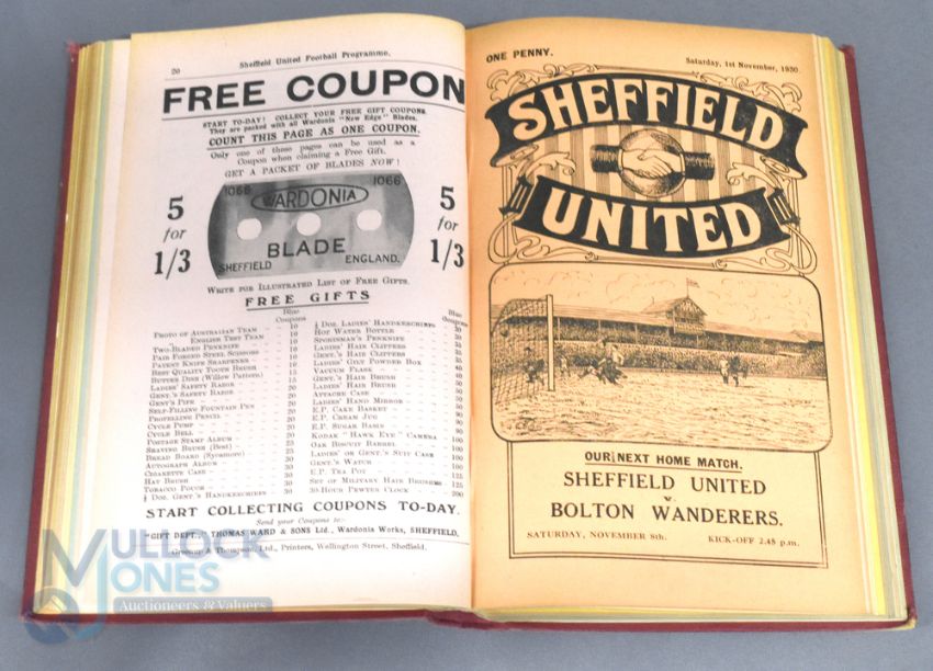 1930/31 Sheffield United Football Programmes Bound Volume - programmes appear with covers, contains England v Ireland 20th October 1930, features League and Reserve fixtures, bound in decorative cloth and gilt boards