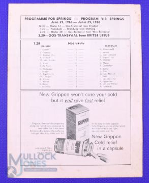 1968 British and I Lions Rugby Programme v Eastern Transvaal: At Springs, 29/6/68. 4pp, slight and scarce, G