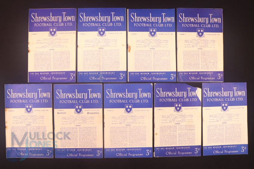1952/53 Shrewsbury Town Div. 3 (South) home match programmes Exeter City, QPR, Leyton Orient, Bristol Rovers, Colchester Utd, Southampton (FAC), Finchley (FAC), Chesterfield (FAC) (poor), QPR (FAC); fair. (9)