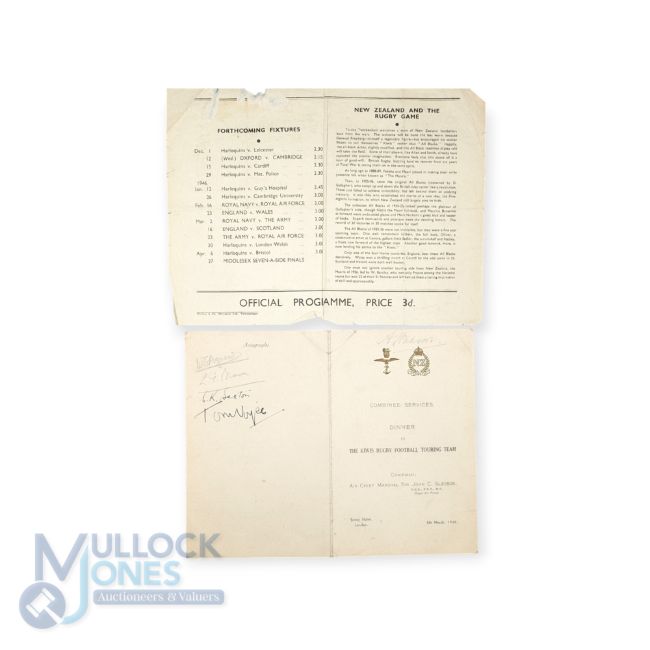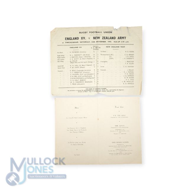 1945-46 NZ 'Kiwis' Rugby Programmes and Menu (2): The single sheet (some edge tears/folds) issue from Twickenham for the match between England and the touring Army XV postwar; and the Savoy menu, signed by visiting skipper Charlie Saxton, Tom Voyce, Leo Brown and one more and two more, for the Combined Services clash, March 1946: VG. Formerly the possession of Arthur Hudson, 8 England caps in the 1900s and 'Grand Old Man' of Gloucester Rugby