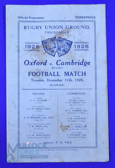 1928 Varsity Match Rugby Programme: Folds, grubby, marks to front, Cambridge four-timer, usual blue 4pp card