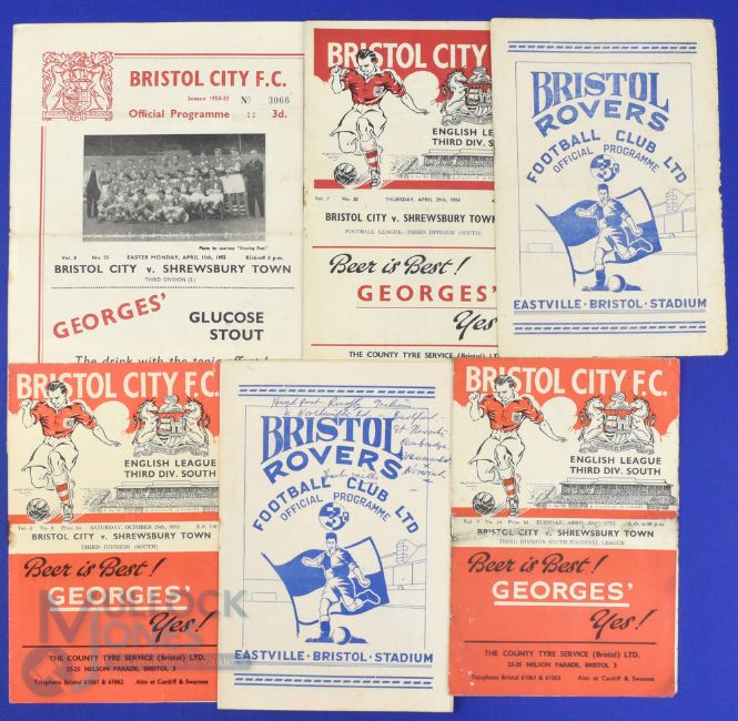 Shrewsbury Town away match programmes 1951/52 Bristol City (poor), Bristol Rovers (poor), 1952/53 Bristol City, Bristol Rovers, 1953/54 Bristol City, 1954/55 Bristol City; fair at best. (6)