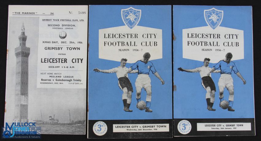 Selection of Grimsby Town football programmes (12) features 1996/97 Postponed match Oxford Utd v Grimsby Town Div. 1 programme 1 January 1997. G; Pre-war 1934/1935 Chelsea v Grimsby Town Div. 1 match programme 29 September 1934; has age wear, rusty staple, fair at best, 1956/57 Grimsby Town v Leicester City home (Xmas Day) programme; away at Leicester City (Boxing Day) (POSTPONED), away at Leicester City 26 January 1957; fair, 1956/57 Grimsby Town, British Rail Day Excursion card January 12th to London Kings Cross for match v Leyton Orient plus match programme also includes home match programme v Leyton Orient (8 September 1956). F, 1990/91 Grimsby Town v CIBA-GEIGY FC charity match programme 12 May 1991, 4 page card with insert, 1948/49 West Ham Utd v Grimsby Town Div. 2 match programme 27 November 1948, match abandoned; neat punch holes, team changes., 1928/1929 L.N.E.R. special half day excursion by steam train from Nottingham to Cleethorpes, travel flyer for the Grimsby Town v Nottingham Forest match at Blundell Park; single sheet, has small insignificant hole, o/wise good, Pre-war 1932/1933 Fulham v Grimsby Town Div. 2 match programme 29 April 1933 at Craven Cottage, has tear to cover (small paper loss), rust mark, o/all poor condition