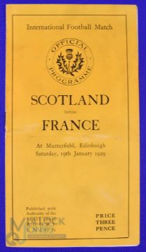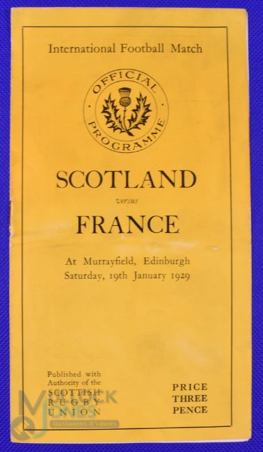 Scarce 1929 Scotland v France Rugby Programme: The hosts beat France 6-3. Standard Murrayfield slim orange 8pp issue. Spine and staple intact, VG