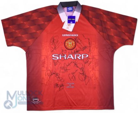 1997/98 Manchester United Multi-Signed home football shirt in red Umbro/Sharp, XXL, short sleeve, 15x Signatures to front in ink, features David Beckham, Ole Gunnar Solskjaer, Paul Scholes, Rio Ferdinand, Roy Keane, Andy Cole, Jordi Cruyff etc - Shirt donated by the Club with Proceeds donated to the Derbyshire Fire & Rescue