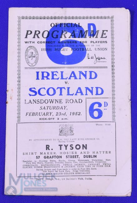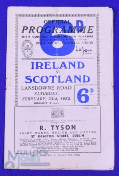 1952 Ireland v Scotland Rugby Programme: Some creases, folds and marks to team pages of this Lansdowne Road Celtic clash, o/wise FG