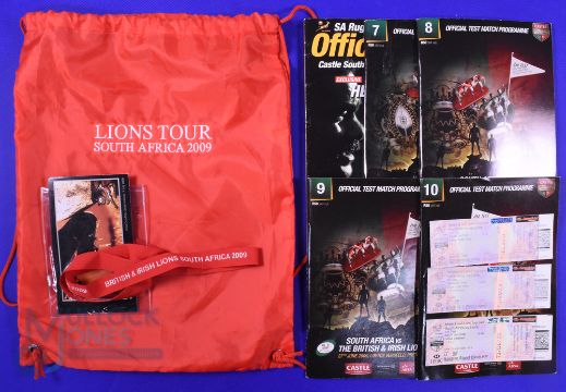 2009 British and I Lions to S Africa Rugby Selection (11): Customised tour bag to include lanyard for official hospitality and tickets - three for the 2nd and two for the 3rd tests, plus a full set of three test programmes, along with the quirky scarcer 'extra' issue, the wrongly-numbered 'No.8' instead of No.9 for the 2nd test, and the Official Guide to the series. VG