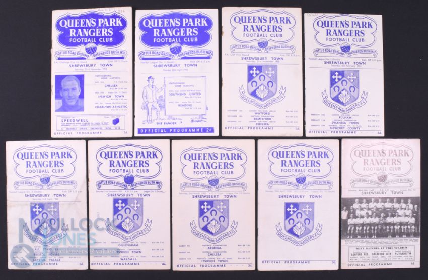 Shrewsbury Town away match programmes v Queens Park Rangers 1952/53 (FAC), 1952/53, 1953/54 (FAC), 1953/54, 1954/55, 1955/56, 1956/57, 1957/58, 1959/60; fair. (9)