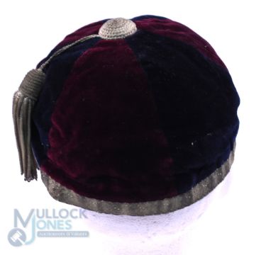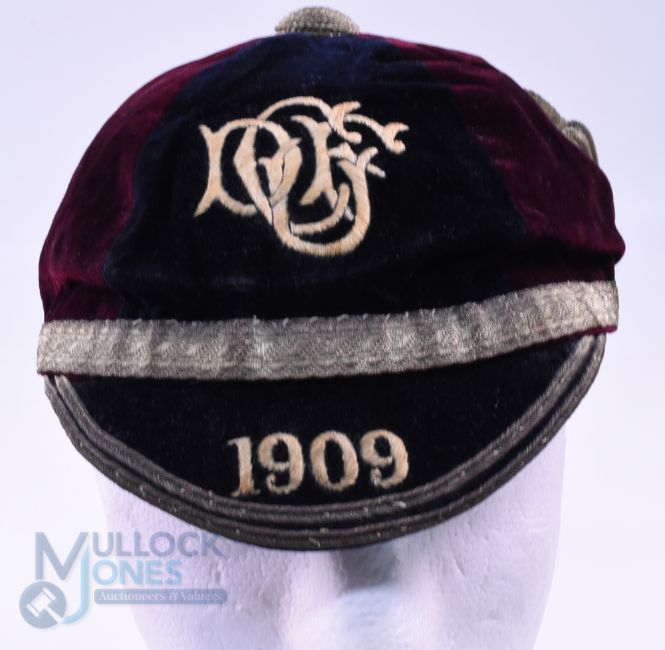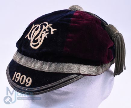 1909 Durham University (?) Velvet Rugby Honours Cap: Black and maroon 6-panel cap with DUFC monogram and 1909 in gold with braid and tassel and VG condition all round at 115 years old