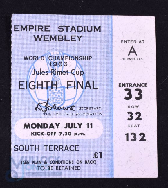 1966 World Cup Opening Match Ticket 1/8 final England v Uruguay at Wembley 11 July 1966; fair/good. (1)