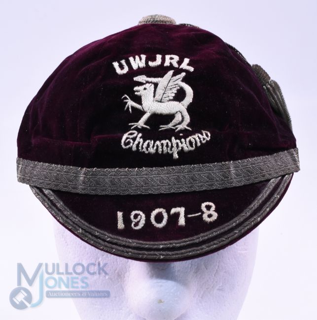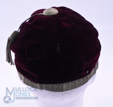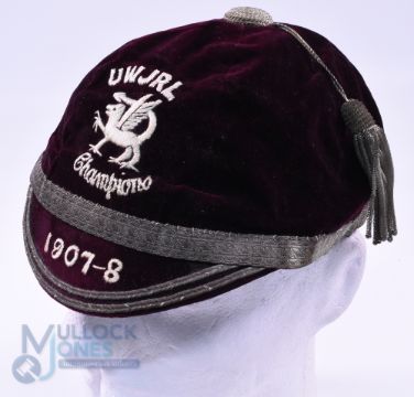 1907-8 University of Wales Junior Rugby Velvet Honours Cap: Maroon cap with silver braiding, tassel, badge and title, 1907-8 to peak. VG condition indeed for age