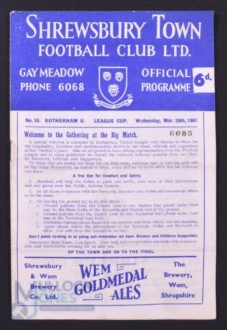 1960/61 Football League Cup s/f Shrewsbury Town v Rotherham Utd 29 March 1961 match programme; slight crease. (1)