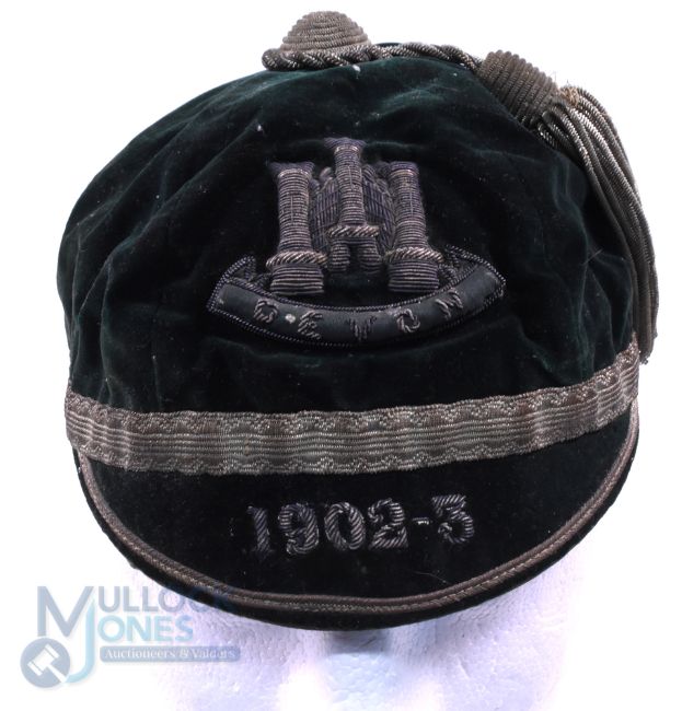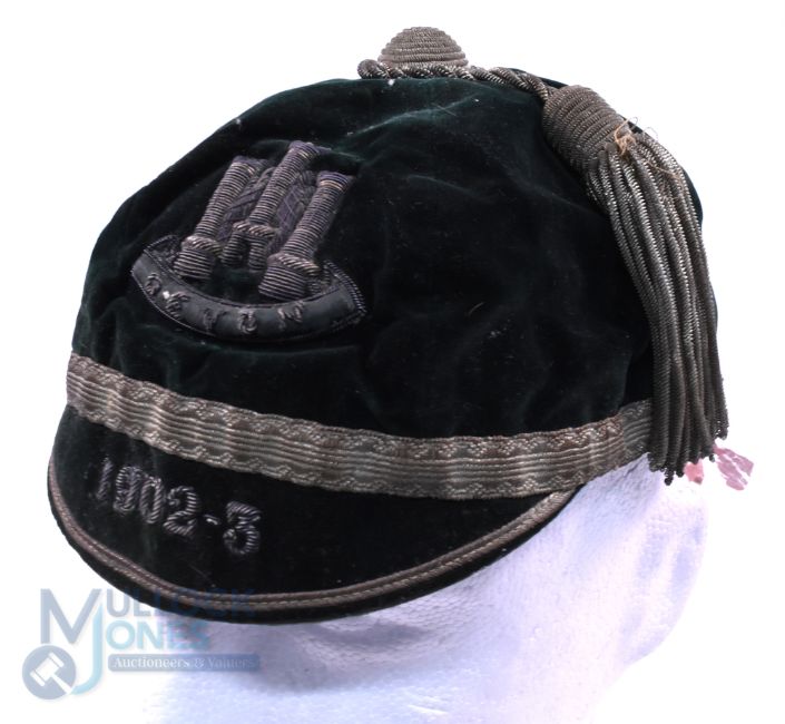 1902-3 Devon County Velvet Rugby Honours Cap: Classic dark green county example, with Devon crest and name and 1902-3 to peak. Gold braid and tassel. Outer splendid, much fraying and loss to the silk inner but 'invisible' when displayed. Great chance, over 120 years old