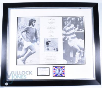 1993 23 ½" x 20 ½" Framed and glazed montage of George Best, Rodney Marsh and Wilf McGuinness, with signatures (3); good. (1)