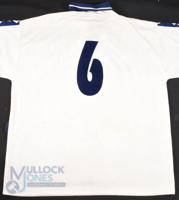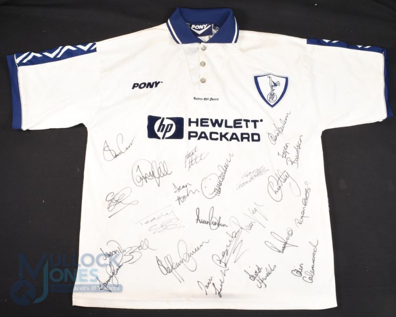 1996/97 Tottenham Hotspur Multi-Signed Colin Calderwood No 6 training football shirt in white, Pony/Hewlett Packard, short sleeve, features 20x Signatures in ink to the front, features Teddy Sheringham, Colin Calderwood, Gary Mabbutt, Sol Campbell, Espen Baardsen, Ramon Vega, etc - Shirt donated by the Club with Proceeds donated to the Derbyshire Fire & Rescue