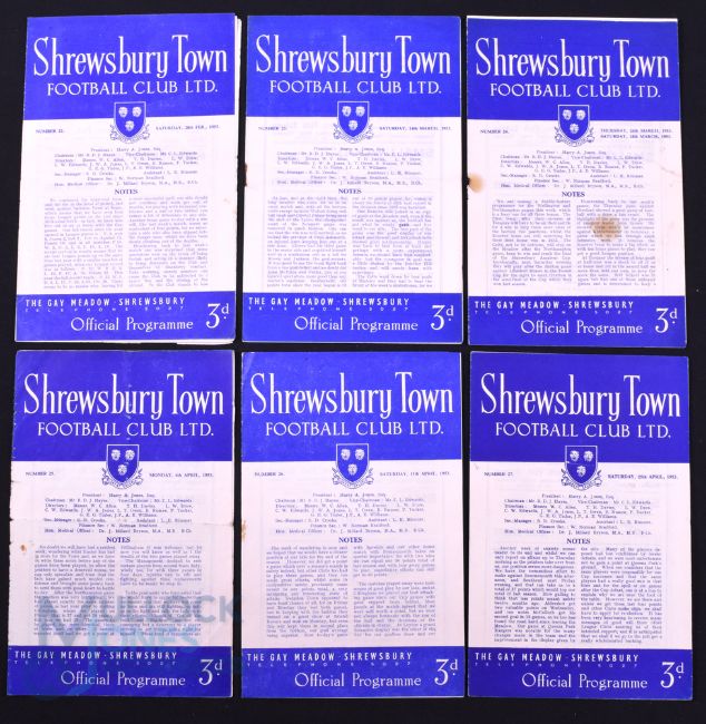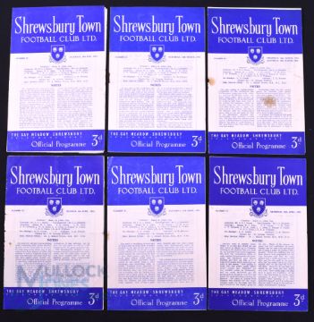 1952/53 Selection of Shrewsbury Town home match programmes v Newport County, Bristol City, Northampton Town/Wellington Town double issue, Gillingham, (poor) Ipswich Town, Bournemouth; fair at best. (6)