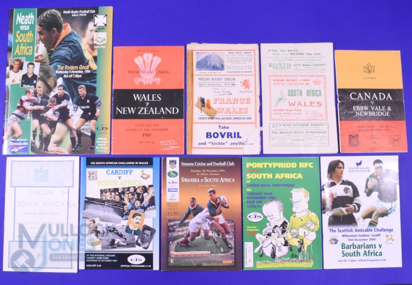 1950-2000 Tourists in Wales Rugby Programmes (10): Wales v NZ 1953 (last home win, first Wales mag-style), v France 1950 and SA 51, both worn; S Africa v Cardiff 1960 and 94; v Swansea, Pontypridd and Neath 1994 and v Baabaas 2000; and Canada v Ebbw Vale/Newbridge 1962. O/wise G
