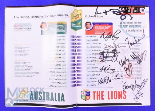 2001 British and I Lions Signed Rugby Programme: The fine large First Test issue, boldly signed by 18 Lions to their team page. Splendid