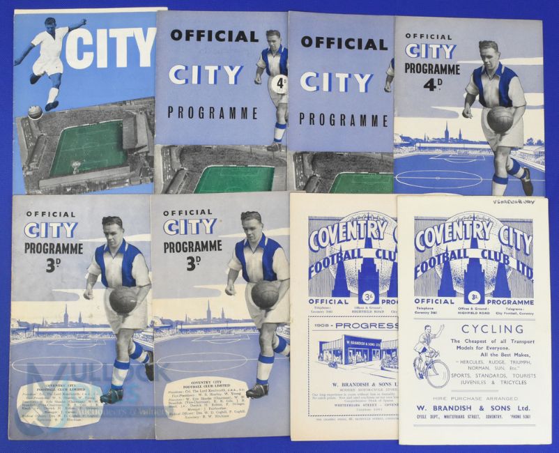 Shrewsbury Town away match programmes v Coventry City 1952/53, 1953/54, 1954/55, 1955/56, 1956/57, 1957/58, 1958/59, 1959/60; fair. (8)