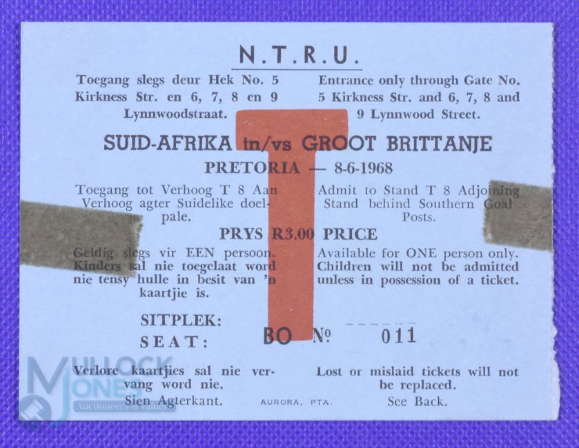 1968 British and I Lions Rugby, Ticket First Test Pretoria: Large blue card stand ticket for the first test, small old Sellotape marks to two margins