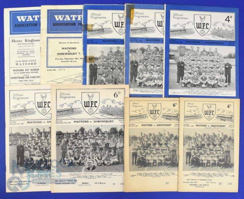 Shrewsbury Town away match programmes v Watford 1951/52 1952/53, 1953/54 (poor), 1954/55 (poor), 1955/56, 1956/57, 1957/58, 1958/59 (April-abandoned), 1958/59 (May); fair. (9)