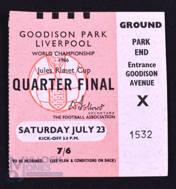 1966 World Cup quarter final Match Ticket Portugal v North Korea 23 July 1966 at Everton; famous 5-3 score, Eusebio scoring 4 for Portugal; good. (1)