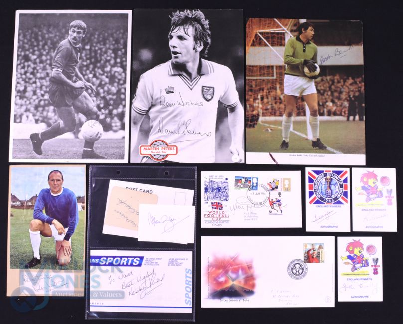 1966 England World Cup winners autographs to include Gordon Banks (magazine photo), Ray Wilson (on card), Nobby Stiles (on card), Jackie Charlton (on card), George Cohen (on card), Bobby Charlton (on paper), Martin Peters (magazine photo), Roger Hunt (on magazine photo), John Connelly (on card), Ian Callaghan (on card), Alan Ball (on card) plus Jimmy Greaves (First Day Cover) 1 June 1966 franked stamps on card, Royal Mail Entertainers Tale 1st day cover Millenium 1999 cover (Bobby Moore on stamp) (A Lot)