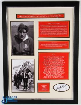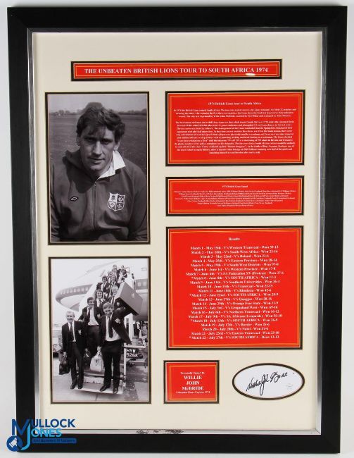Large Framed W J McBride 1974 Lions Rugby Display: Lovely professionally-created ltd. ed. display, ideal for home, club or office, approx 60cm x 75cm, coloured captions and trim, explanatory note, photographs and fine signature by Willie-John in crisp black marker on white card. Excellent item