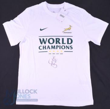 2023 Siya Kolisi Signed Springbok Rugby WC Winners T-Shirt: Mint with Nike tag, M size white official S African Springboks example, green and gold badged and 'World Champions 1995, 2007, 2019 and 2023' legend. Neatly signed to front in black marker for the vendor by SA skipper Siya Kolisi after a game at Bath. Very desirable!