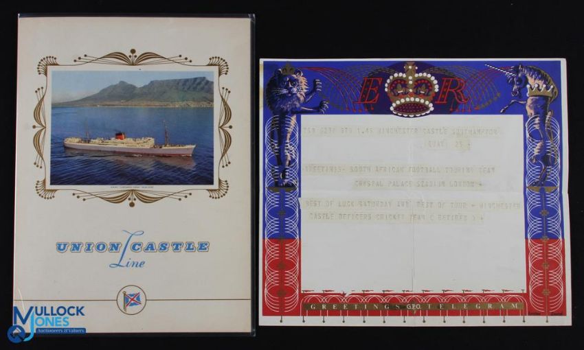 1958 South African football team tour of the UK 'Farewell Dinner' on the ship 'Caernarvon Castle' 3rd December 1958 returning to Cape Town fully signed by the team squad to the back cover; the 4 page Union Castle line menu has been laminated; also has a telegram with greetings to the S.A. squad sent by the Winchester Officers cricket team; F/G