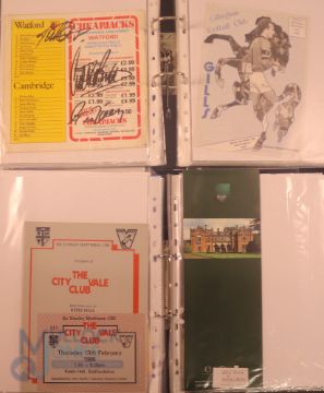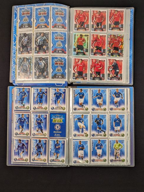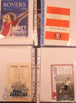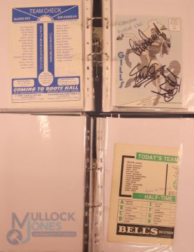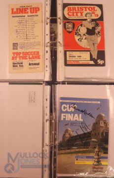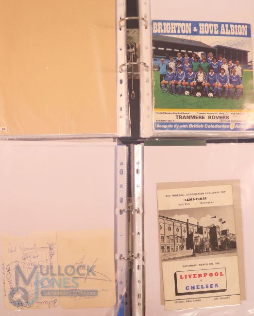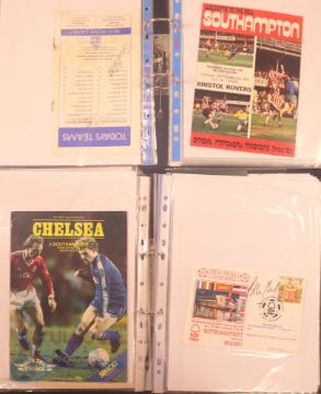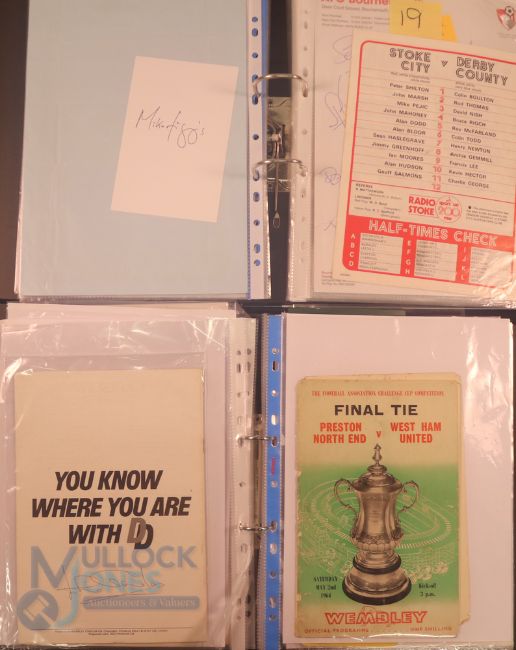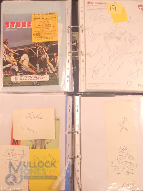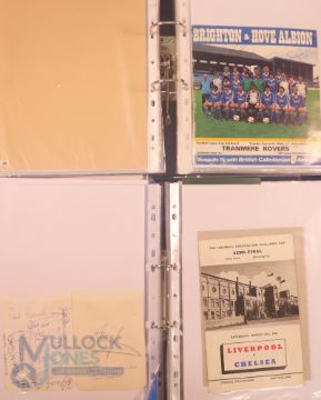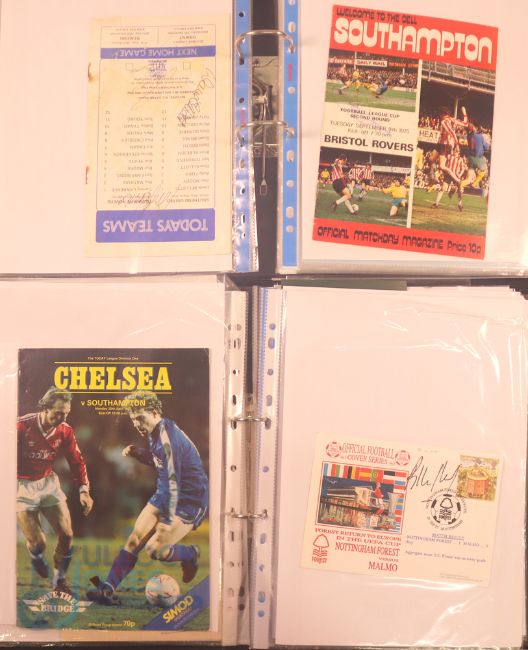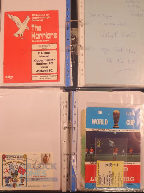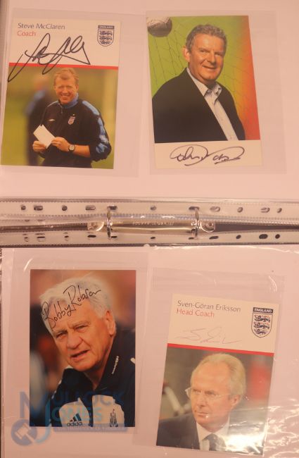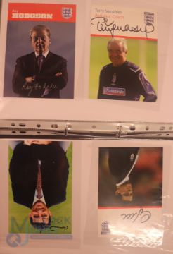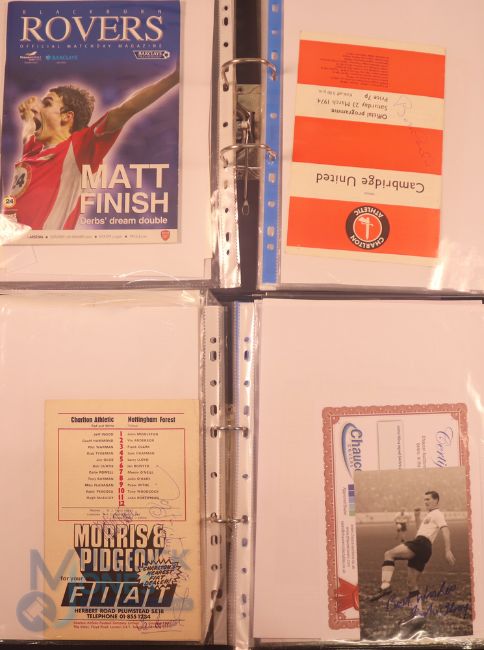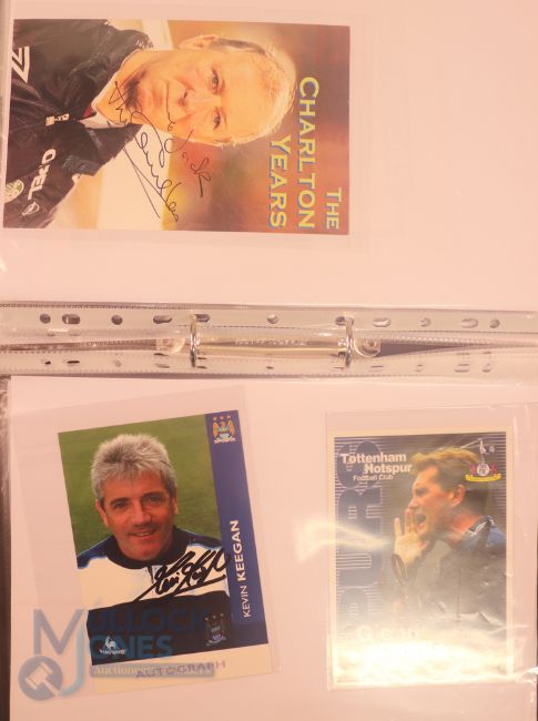 Collection of football memorabilia to include Topps Match Attax trading cards 2008/09 185 cards in official binder; 2013/14 70 cards in official binder: b&w action photo of Bobby Tambling (Chelsea) with signature (COA); A folder with autographed match programmes including FAC finals, some match tickets, player signatures on autograph book pages (detached from book), postcards of former England managers with signatures (10), colour photos of players each signed Middlesbrough (2), Newcastle Utd (6 including David Ginola and Alan Shearer), Album page of England 1960s/1970s players (Cherry, Madeley, McDonald, Jones, Armfield, Keegan, Thomas & Don Revie (COA) plus other match programmes with signatures (a quantity); (A Lot)