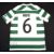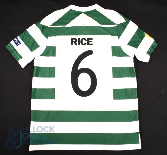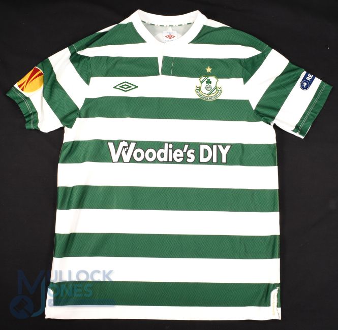 2010/11 Stephen Rice No 6 Shamrock Rovers match worn home football shirt v Tottenham Hotspur 15 Dec 2011, UEFA shoulder patches, in green and white, Umbro/Woodie's DIY, size L, short sleeve - obtained via team personnel