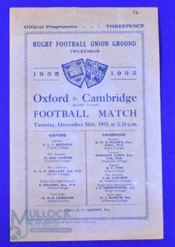 1935 Varsity Match Rugby Programme: Obolensky on an Oxford wing, Wooller and Cliff Jones for Cambridge in a no-score draw, only the third such result!