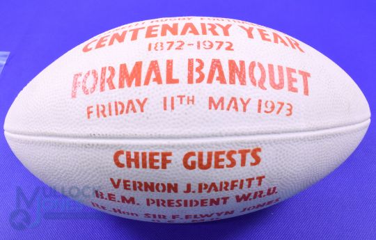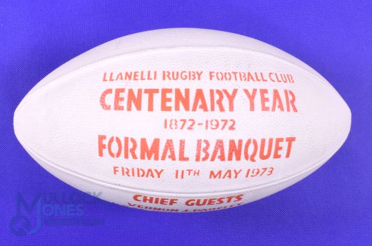 1972-3 Llanelli RFC Centenary Plastic Full Size Ball: Scarce, table ornament from the huge function held in celebration over 50 years ago, cream, captioned in red. G