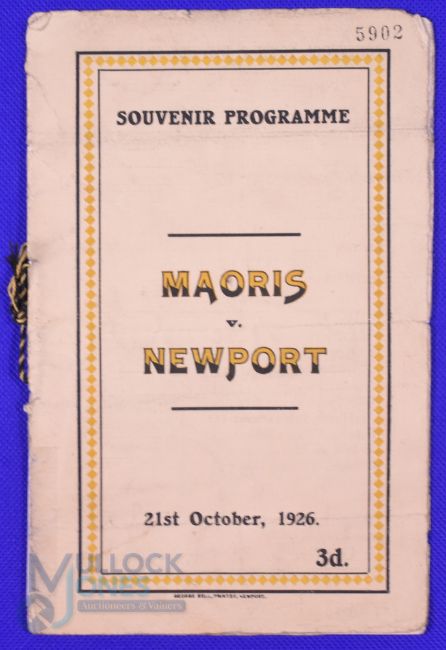 Rare 1926 Newport v the Maoris Rugby Programme: Famous match, famous teams, very hard to find, some wear but entire, inc black and amber 'spinal cord', 8pp with stiffer covers, attractive if a little grubby to lower rear cover. 'Find me another!'