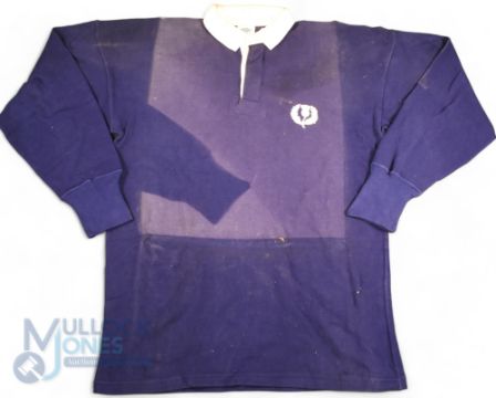 1986 Scotland Iain Milne Matchworn Rugby Jersey: Classic Scottish blue Umbro example with thistle badge, worn by prop Iain Milne of that famous rugby family. White no.3 to rear. Faded rectangle to chest after framing, otherwise VG
