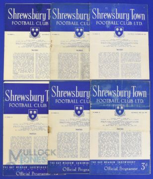 1951/52 Shrewsbury Town Div. 3 (South) home match programmes v Plymouth Argyle (champions), Leyton Orient, Southend Utd, Gillingham, Port Vale, Aldershot; fair. (6)