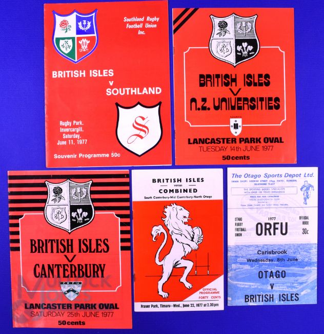 1977 British and I Lions Rugby Programmes (5): v Otago, Southland (JBG Thomas' copy, a few notes, plus ticket), NZ Universities, S and Mid Canterburyand N Otago and Canterbury. VG/Exc