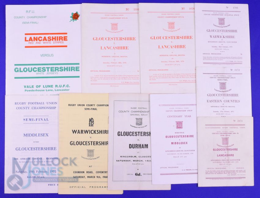1959-77 Gloucester Rugby County Ch. Semis Programmes (10): Glos v Durham (Replay) 59, Warwicks 68 and 75, Mddx 72 and 78, E Counties 73, and Lancs 70, 76(2) and 77. Mostly G or better