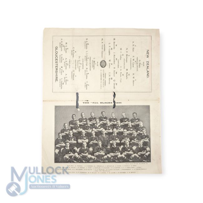 Rare 1924 Gloucestershire v NZ All Blacks Rugby Programme: With broken/ragged punch holes from previous ring binder but otherwise good for its 100 years, extremely hard to find. A 4pp issue still packing in lots of detail, both current to the day and historic, as the 'Invincible' All Blacks, George Nepia and all, struggled to beat Gloucestershire 6-0 at Kingsholm. Marvellous memorabilia
