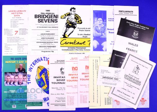 1965-2005 Rugby Sevens etc in Wales Programme etc Pot-Pourri (15): Issues from tournaments at Aberaeron, Bridgend, Blackwood plus ticket, Cwmtawe, Penarth, Pontllanfraith, International 7s at Abertillery Park, Mon Junior Union, Gareth Edwards' Sevens at Cardiff and Wales v France Golden Oldies, great names at Cross Keys. Gen G/VG