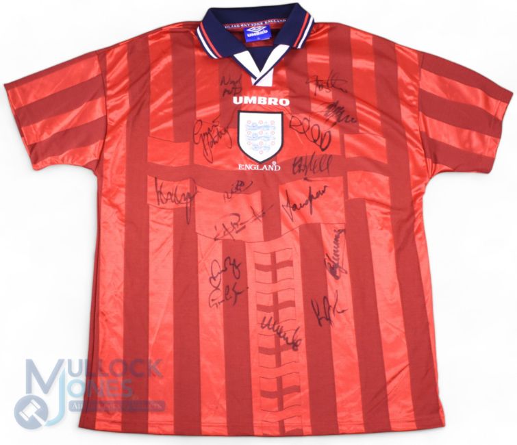 1997/98 Multi-Signed England International away football shirt in red, Umbro XL, short sleeve, with 15x signatures such as Gareth Southgate, Tony Adams, etc in ink to front, Vapa Tech performance embroidered emblem - Shirt donated by the Club with Proceeds donated to the Derbyshire Fire & Rescue