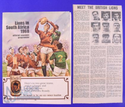 1968 British and I Lions Rugby, Souvenir Tour Programme etc (3): Large colourful SA preview brochure, along with a copy of the team sheet insert from the 4th test and 'Meet the Lions' press cutting. VG