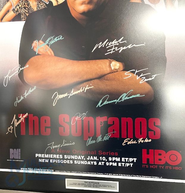 The Sopranos Autographed poster print - signed in ink by the cast to include James Gandolfini, Edie Falco, James Lynn Sigler, Michael Imperiloli, Lorraines Braco, Robert Iler, Stevan Van Zandt, Tony Sirico, Dominic Chianese, Aida Turturro, Vincent Pastore and Drea Dematteo, plaque to front, well presented, framed measures 85x120cm approx.